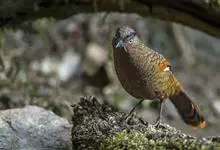 玉山噪鹛中等体型的褐色鸟类。白色长眉纹及髭纹显著;顶冠灰而具白色的鳞状斑纹;脸侧及颏褐色,喉及颈背褐色并具灰色羽缘而成的鳞状纹。腹部灰,臀栗色。两翼及尾青石蓝灰,外侧羽羽缘黄褐,初级飞羽羽缘黄褐。…全部>>