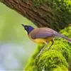 黄喉噪鹛体型略小,顶冠蓝灰色,特征为具黑色的眼罩和鲜黄色的喉。上体褐色,尾端黑色而具白色边缘,腹部及尾下覆羽皮黄色而渐变成白色。黄喉噪鹛隐匿于亚热带常绿林和浓密灌丛,于地面杂物中取食,喜食昆虫,…全部>>