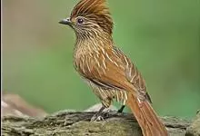条纹噪鹛是画眉科、噪鹛属中型鸟类,体长28-32厘米。头具短的羽冠,上体栗褐色,飞羽外翻蓝灰色。下体棕栗色,腹以后转为褐白色。除飞羽和尾羽外,所有上、下体羽均具白色羽干纹。极为醒目。野外特征明显,…全部>>