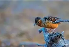 大噪鹛:中型鸟类,体长32-36厘米。额至头顶黑褐色,背栗褐色满杂以白色斑点,斑点前缘或四周还围有黑色。初级覆羽、大覆羽和初级飞羽具白色端斑。尾特长,均具黑色亚端斑和白色端斑。颏、喉棕褐色,…全部>>