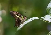 青带凤蝶Graphium sarpedon ,又名青凤蝶,是最普遍的中型凤蝶,飞行速度很快。青带凤蝶的翅膀中央有许多浅蓝色的斑点,很整齐地排列成一条直线。这些斑点由上而下逐渐变大,就像一条青色的带子。全部>>