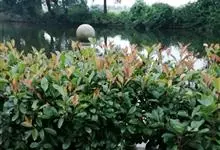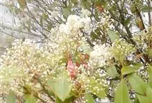 石楠 Kalkman),是蔷薇科石楠属的常绿乔木,高5~12米,株型紧凑,树冠圆球形。树枝为褐灰色;鳞片为褐色,没有毛;叶片革质,长椭圆至侧卵状椭圆形,有锯齿,新叶红色光亮。复伞房花序,白色小花,…全部>>