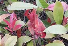 红叶石楠 是蔷薇科,石楠属杂交种,为常绿小乔木或灌木,乔木高可达5米、灌木高可达2米。叶片革质,长圆形至倒卵状、披针形,叶端渐尖,叶基楔形,叶缘有带腺的锯齿,花多而密,复伞房花序,花白色,梨果黄红色,…全部>>