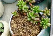 玉米石是景天科、景天属植物。多年生草本多浆植物。植株低矮丛生,多分枝。叶膨大成圆筒形、卵形或近小球形,互生至簇生,长0.6-1.2厘米,宽0.4-0.7厘米,叶端钝圆,亮绿色,肉质,硝带红晕,…全部>>