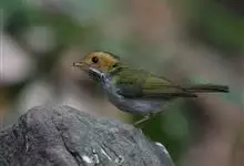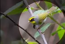 棕脸鹟莺:体长10厘米,是一种色彩亮丽而有特色的莺鸟。头栗色,具黑色侧冠纹。上体绿,腰黄色。下体白,颏及喉杂黑色点斑,上胸沾黄。与栗头鹟莺的区别在头侧栗色,白色眼圈不显著且无翼斑。…全部>>