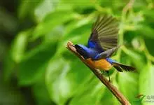棕腹大仙鹟:体重24-28克,体长15-17厘米,是一种小型的色彩亮丽的鹟。雄鸟上体深蓝,下体棕色,脸黑,额、颈侧小块斑、翼角及腰部亮丽闪辉蓝色。与棕腹仙鹟易混淆,区别在色彩较暗。雌鸟灰褐,…全部>>