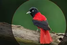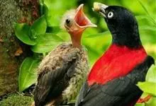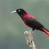 朱鹂:中等鸟类,体长23-28厘米。雄鸟绛紫红色,头、上胸及翼黑色。雌鸟上背及背部深灰色,尾覆羽及尾绛紫红色,腹部及下胸白而密布黑色纵纹。与鹊色鹂幼鸟的区别在上背灰色较深,下体白色较少且纵纹较粗。…全部>>