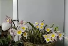 玫瑰石斛是兰科石斛属的多年生附生草本植物。茎斜下或下垂,青绿色,圆柱形,节间鞘具绿或白色相间的条纹;叶窄披针形;花序短,生于已落叶的老茎上部,花序梗长,萼片和花瓣白色,上部带淡紫色,干后蜡质状,…全部>>