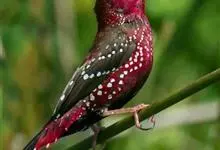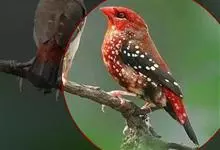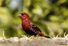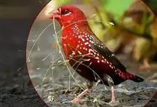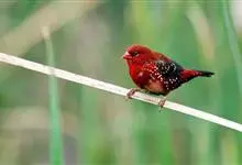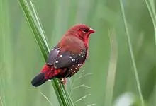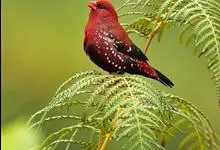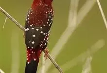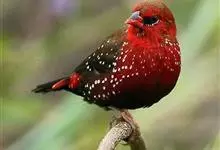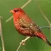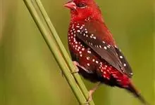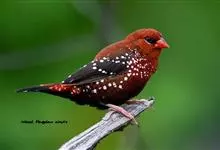红梅花雀小型鸟类,体长9-10厘米。雄鸟通体朱红色,背、肩、胸等满布白色小斑点,两翅和尾黑褐色均具白色端斑,嘴红色,脚蜡黄色。雌鸟上体淡褐色或赭褐色,翅上中覆羽、大覆羽和内侧飞羽末端具白色斑点,…全部>>