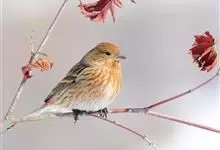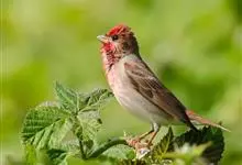 普通朱雀是雀形目雀科朱雀属鸟类,又名红朱雀、马料、青麻料。雄鸟上体红色,下体淡红色;头部、喉部、胸部及腰部亮红色;背部褐色染红色;两翼及尾黑褐色,羽缘染红色。雌鸟上体橄榄褐色,下体近白色,…全部>>