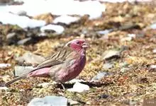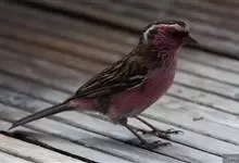 喜马拉雅白眉朱雀:小型鸟类,体长15-17厘米,体重24-35克。额基、眼先深红色,前额和一条长而宽阔的眉纹珠白色沾有粉红色并具丝娟光泽,在暗色的头部极为醒目。头顶至背棕褐或红褐色、具黑褐色羽干纹,…全部>>