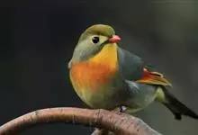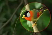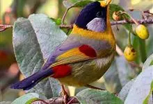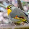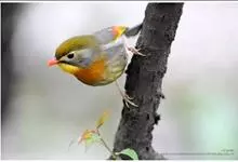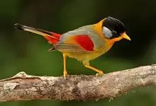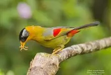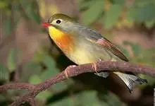银耳相思鸟小型鸟类,体长14~18厘米。头顶黑色,耳羽银灰色,前额橙黄色;外侧飞羽橙黄色,基部朱红色,极为鲜艳、醒目。尾圆形,尾上、尾下覆羽朱红色,尾暗灰褐色,外侧尾羽橙黄色,其余上体橄榄绿或橄榄黄色。…全部>>