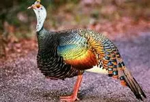 眼斑吐绶鸡:是火鸡科的两种鸟类之一。体型比普通火鸡略小些,体长1米左右,体重2.4-5.4千克,雄性比雌性略大,长得很特别,蓝色的秃脑袋上冒出几个橙黄色的疙瘩。但是它羽色艳丽,身体呈铜色及绿色。…全部>>