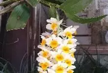 球花石斛,是兰科石斛属的多年生附生草本。茎直立或斜立,圆柱形,粗壮,基部收狭为细圆柱形,不分枝,具数节;叶互生于茎的上端,革质,长圆形或长圆状披针形;总状花序侧生于带有叶的老茎上端,下垂,花密生,黄色,…全部>>