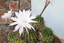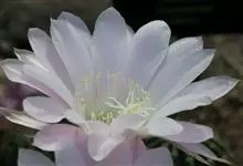 仙人球花 仙人掌科,仙人球属。植株单生或成丛。幼株球形,老株长成圆筒状,高可达75厘米,直径12-15厘米。球体暗绿色,具棱11-12。刺锥状,黑色,长1-1.5厘米。花着生于球体侧方,大型嗽喇叭状…全部>>