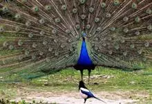 蓝孔雀,是鸡形目雉科孔雀属中的一种鸟。蓝孔雀是鸡类中的“巨人”,雄鸟和雌鸟的羽色有差,雄鸟头上具冠羽,头、颈和胸部均为蓝色,尾羽并不长,构成尾屏的尾上覆羽可达身长的2倍,平时合拢托在身后,…全部>>