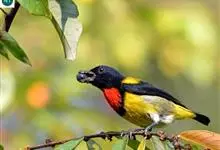 黄腹啄花鸟:体重11-16克,体长104-117毫米。是一种体型大,下腹部为艳黄色的啄花鸟,雄鸟特征为头黑色,喉部有白色纵斑、喉侧及上体成对比,两翅和尾黑色,外侧尾羽内翈具白色斑块。其余下体淡黄色。…全部>>