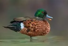 琵嘴鸭又名铲土鸭、琵琶嘴鸭,是雁形目鸭科鸭属鸟类。雄鸟头颈部墨绿色带金属光泽,背、腰暗褐色;尾上覆羽墨绿色,中央尾羽暗褐色带白色端斑,外侧尾羽白色;翼褐色,具金属绿色翼镜,翼镜前缘有宽白带,…全部>>