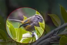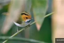 棕脸鹟莺:体长10厘米,是一种色彩亮丽而有特色的莺鸟。头栗色,具黑色侧冠纹。上体绿,腰黄色。下体白,颏及喉杂黑色点斑,上胸沾黄。与栗头鹟莺的区别在头侧栗色,白色眼圈不显著且无翼斑。…全部>>