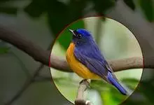 棕腹大仙鹟:体重24-28克,体长15-17厘米,是一种小型的色彩亮丽的鹟。雄鸟上体深蓝,下体棕色,脸黑,额、颈侧小块斑、翼角及腰部亮丽闪辉蓝色。与棕腹仙鹟易混淆,区别在色彩较暗。雌鸟灰褐,…全部>>