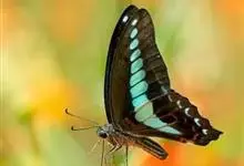青带凤蝶Graphium sarpedon ,又名青凤蝶,是最普遍的中型凤蝶,飞行速度很快。青带凤蝶的翅膀中央有许多浅蓝色的斑点,很整齐地排列成一条直线。这些斑点由上而下逐渐变大,就像一条青色的带子。全部>>