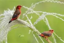 红梅花雀小型鸟类,体长9-10厘米。雄鸟通体朱红色,背、肩、胸等满布白色小斑点,两翅和尾黑褐色均具白色端斑,嘴红色,脚蜡黄色。雌鸟上体淡褐色或赭褐色,翅上中覆羽、大覆羽和内侧飞羽末端具白色斑点,…全部>>
