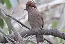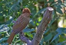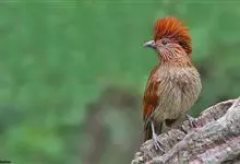 条纹噪鹛是画眉科、噪鹛属中型鸟类,体长28-32厘米。头具短的羽冠,上体栗褐色,飞羽外翻蓝灰色。下体棕栗色,腹以后转为褐白色。除飞羽和尾羽外,所有上、下体羽均具白色羽干纹。极为醒目。野外特征明显,…全部>>