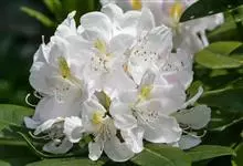大白杜鹃是杜鹃花科杜鹃花属的常绿灌木,高可达5米。幼枝绿色,无毛;叶厚革质,长圆形或圆状倒卵形,先端钝或圆,基部楔形;总状伞形花序顶生,花序轴疏生白色腺体,花梗粗,具白色有柄腺体,冠宽漏斗状钟形,…全部>>