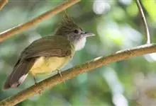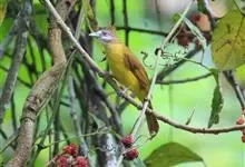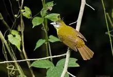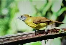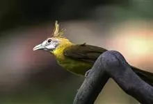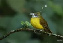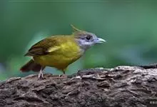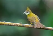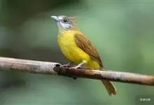 黄腹冠鹎:体长19-24厘米,是一种体型略大的褐色鹎。头顶橄榄褐色具黑褐色羽冠。白色的喉膨起,下体黄色。似白喉冠鹎但较鲜亮,上体褐色较重,腹部为鲜亮的柠檬黄色。虹膜褐色;嘴黑色;脚粉红色。…全部>>
