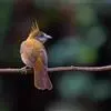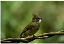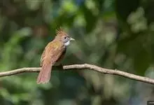 白喉冠鹎:体长20-25厘米。头顶红褐色,有长而细的羽冠、红褐色,头侧灰色。上体橄榄绿黄色,飞羽暗褐色,外翈茶黄色,尾下覆羽皮黄色。…全部>>