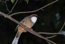 白喉噪鹛中型鸟类,体长26~30厘米。前额或整个头顶棕栗色,其余上体橄榄褐色。颏、喉白色,胸具橄榄褐色横带,腹辉棕色或棕白色。外侧四对尾羽具宽阔的白色端斑。指名亚种的额呈棕色,…全部>>