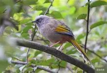 橙翅噪鹛:是噪鹛科、彩翼噪鹛属的中型鸟类,体长22-25厘米。头顶深葡萄灰色或沙褐色。上体灰橄榄褐色,外侧飞羽外翈蓝灰色、基部橙黄色,中央尾羽灰褐色,外侧尾羽外翈绿色而缘以橙黄色并具白色端斑。…全部>>