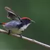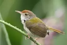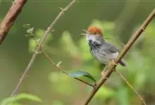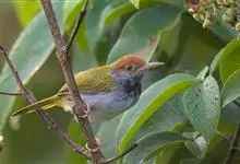 黑喉缝叶莺:体长11.5厘米,是一种小型的顶冠棕色、腹部白色的莺。尾甚长而常上翘,臀黄色,具特征性的偏黑色喉,上体橄榄绿色,头侧灰色。雌鸟色暗,头少红色且喉少黑色。与长尾缝叶莺的区别在后顶冠亦为棕色,…全部>>