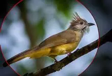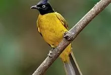黑冠黄鹎:体长18-21厘米,是一种中等体型偏黄色鹎。整个头、颈、颏、喉黑色,头顶有显著直立的羽冠,黑色,上体褐橄榄黄绿色,下体橄榄黄色。虹膜偏红;嘴及脚黑色。…全部>>