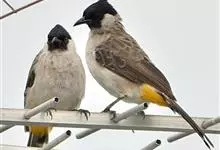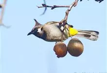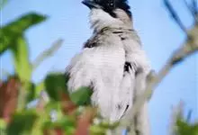 白颊鹎是雀形目鹎科鸟类。体长19—21厘米。雌雄相似。成鸟头部深灰色具一显著的羽冠,白色脸侧具一黑色点状斑纹。颏部、喉部黑色;胸部、腹部、两胁近白色;背部、两翼近灰色;尾下覆羽黄色,尾羽灰色,…全部>>