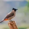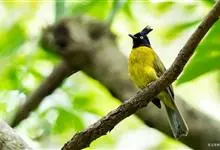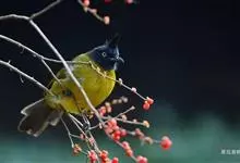 黑冠黄鹎:体长18-21厘米,是一种中等体型偏黄色鹎。整个头、颈、颏、喉黑色,头顶有显著直立的羽冠,黑色,上体褐橄榄黄绿色,下体橄榄黄色。虹膜偏红;嘴及脚黑色。…全部>>