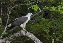 蛇雕是鹰形目鹰科蛇雕属鸟类,又称蛇鹰、白腹蛇雕、冠蛇雕。成鸟额部白色,头顶黑色,枕部黑色带白斑的冠羽可呈扇状打开;上体暗褐色,具窄的白色羽缘;尾黑色,具一条白色的宽中央横带及白色的窄外缘;翼褐色杂白斑,…全部>>