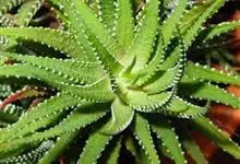 条纹十二卷 Haw.)是芦荟科十二卷属植物,为多年生肉质草本植物。植株高度10-15厘米,其呈莲座状生长;叶片紧密轮生在茎轴上,柔软多汁,呈长三角状披针形,极肥厚;叶面光滑、扁平,色深绿;叶背突起,…全部>>