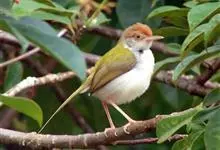 普通缝叶莺,是雀形目鹅科莺亚科缝叶莺属一种。体长10-14厘米,体重7-10克,雄鸟前额棕红,头顶至枕棕橄榄褐,上体橄榄绿染黄,飞羽及尾羽暗褐;繁殖期雄鸟的中央尾羽特形延长,下体淡皮黄白色。…全部>>