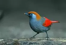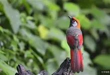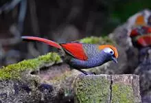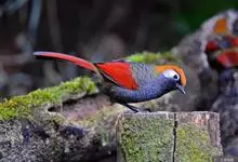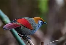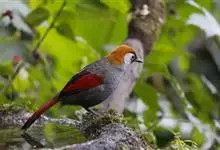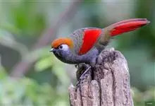 赤尾噪鹛中型鸟类,体长24~28厘米。头顶至后颈红棕色,两翅和尾鲜红色,眼先、眉纹、颊、颏和喉黑色,眼后有一灰色块斑。其余上下体羽大都暗灰或橄榄灰色。特征极明显,特别是通过鲜红色的头顶、翅和尾。…全部>>