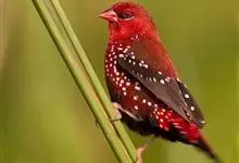 红梅花雀小型鸟类,体长9-10厘米。雄鸟通体朱红色,背、肩、胸等满布白色小斑点,两翅和尾黑褐色均具白色端斑,嘴红色,脚蜡黄色。雌鸟上体淡褐色或赭褐色,翅上中覆羽、大覆羽和内侧飞羽末端具白色斑点,…全部>>