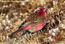 藏朱雀:全长约17-18厘米。雄鸟头部深红色具光辉,喉部暗红色具白色点斑;背部灰白色,各羽具玫瑰红色羽端,形成许多斑纹;腰部淡玫瑰红色;翅暗褐色,沾灰白,羽端沾玫瑰红或灰白色;尾暗棕色,端缘玫瑰红色…全部>>