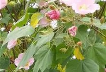 海滨木槿是锦葵科木槿属植物,落叶小乔木,株高3-5米,胸径20厘米,扁球形树冠,枝叶繁盛。厚纸质单叶互生,扁圆形、倒卵形或宽倒卵形,先端钝近平,具短突尖,基部圆形或浅心形,叶缘中上部具细圆齿,…全部>>