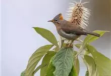栗耳凤鹛,雌雄羽色相似。额、头顶至枕灰色,头顶有一短的不甚明显的羽冠,系由头顶羽毛向后延长形成、灰色具细的白色羽干纹,眼先灰色,眉纹白色不甚明显,其上有时杂有褐斑,…全部>>