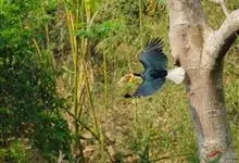 花冠皱盔犀鸟雄鸟体长约105厘米,雌鸟较小。尾白,雄雌两性的背、两翼及腹部均为黑色,但雄鸟头部奶白色,枕部具略红的丝状羽,裸出的喉囊上具明显的黑色条纹。雌鸟头颈黑,喉囊蓝色。成对或小群飞于森林上空,…全部>>
