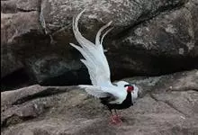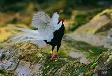 白鹇,是鸡形目雉科鹇属的一种留鸟。雄鸟上体白色并具黑色纹,下体黑色,头顶具黑色长羽冠,尾白而长;雌鸟体型较小,以橄榄褐色为主,下体具白色或皮黄色细纹;虹膜褐色,眼周具红色裸皮,喙黄色,脚鲜红色。…全部>>