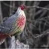 血雉雉科血雉属鸟类,别名血鸡、松花鸡,血雉的雄鸟大覆羽、尾下覆羽、尾上覆羽、脚、头侧、腊膜为红色,故称血雉。其别名甚多,各地皆异。在甘肃,因其胸侧和翅上覆羽沾绿,被称为“绿鸡”;因其羽毛形似柳叶,…全部>>