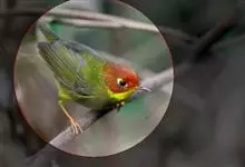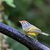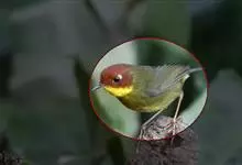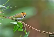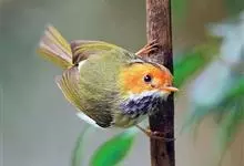 棕脸鹟莺:体长10厘米,是一种色彩亮丽而有特色的莺鸟。头栗色,具黑色侧冠纹。上体绿,腰黄色。下体白,颏及喉杂黑色点斑,上胸沾黄。与栗头鹟莺的区别在头侧栗色,白色眼圈不显著且无翼斑。…全部>>