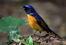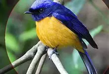 棕腹蓝仙鹟,Niltava vivida,鹟科仙鹟属的一种小型鸣禽,善在空中飞捕昆虫,中等体型18厘米,上体蓝,下体棕色,具黑色眼罩,胸橘黄渐变成臀部的皮黄色。国内分布于四川、云南、西藏和台湾等地。…全部>>