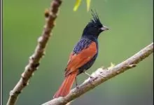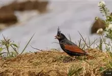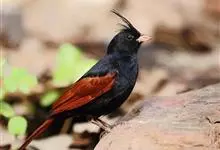 凤头鹀:属小型鸣禽,体重21-31克,体长134-175毫米。以头顶的细长羽冠为特征,雄鸟全身几乎均为黑色具蓝色光泽,两翅和尾以及尾上覆羽栗红色。雌鸟具短的褐色羽冠,上体暗橄榄褐色,…全部>>
